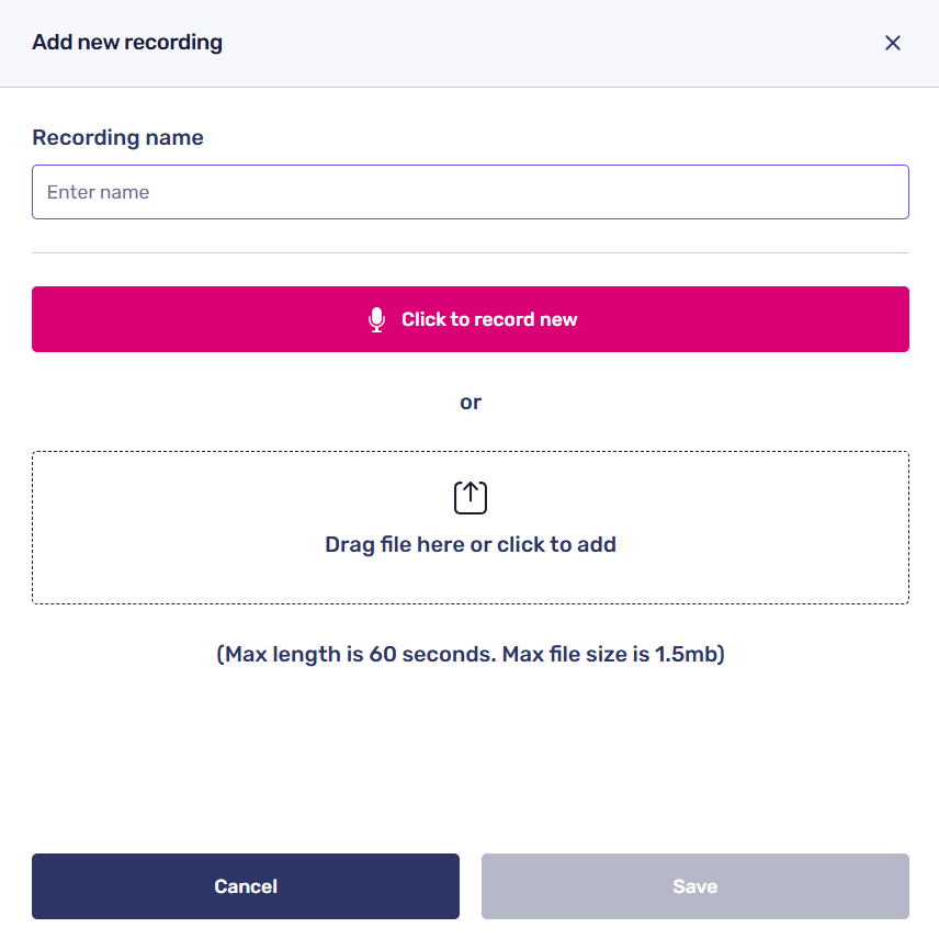 Then, either click to record a new one or drag a file into the drop zone to upload a recording from your computer or device. Please note that the same rules apply to all recording uploads within the app: the maximum length is 60 seconds, and the maximum file size is 1.5 MB.