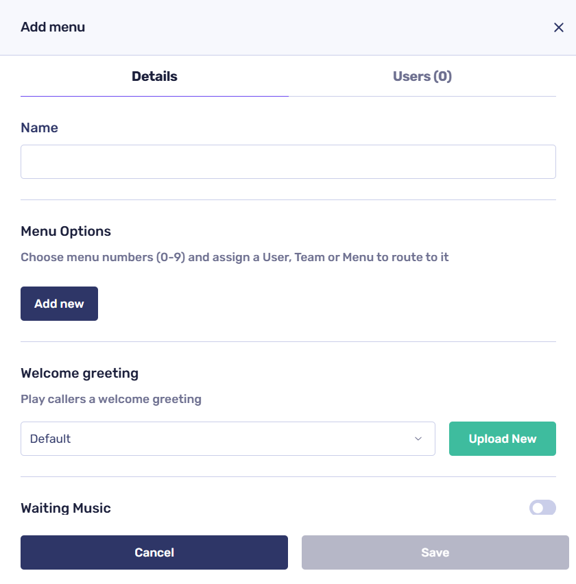 To configure the menu routing settings, start by clicking on ‘Add new’. This will allow you to assign a dial pad number to a user, team, or any previously configured menu.
