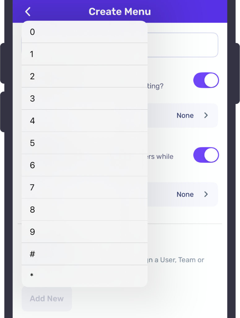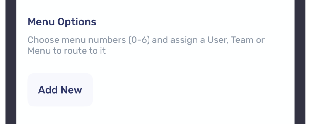 To configure the menu routing settings, start by tapping on ‘Add new’. This will allow you to assign a dial pad number to a user, team, or any previously configured menu.