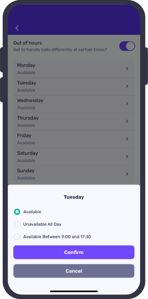 You can configure the ‘Out of Hours’ settings for menus just like you do for your regular calls. To activate this feature, simply toggle the setting to the “on” position.