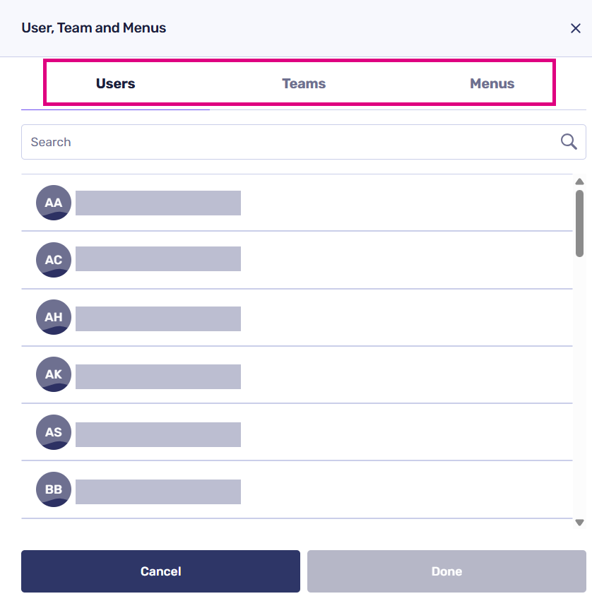 To proceed, click on ‘Select user, team, or menu’ to access the following screen. Use the taskbar at the top to choose a user, team, or menu corresponding to the menu number you have already selected.