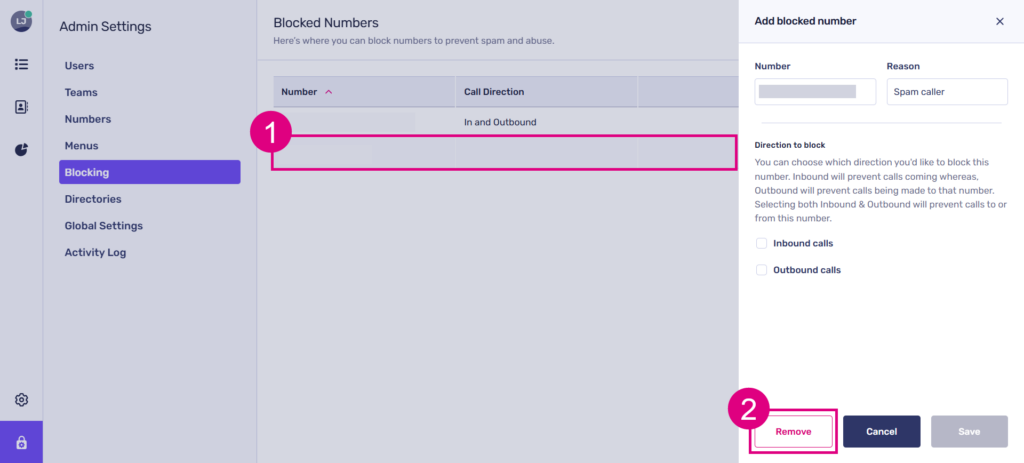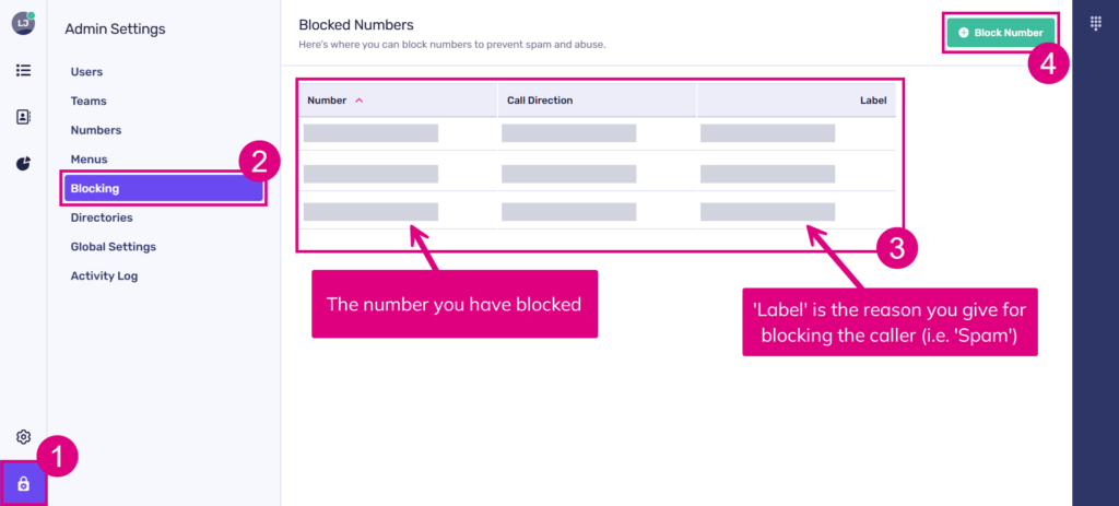 To unblock a number, navigate to the ‘Admin Settings’ menu and choose ‘Blocking.’ From there, select the number you wish to unblock from the ‘Blocked Numbers’ section.
