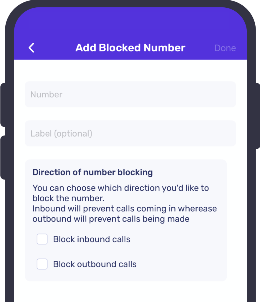 - The rationale for blocking a number, such as identifying it as a spam caller, will be displayed in the ‘Label’ field of the ‘Blocked Numbers’ screen (optional)