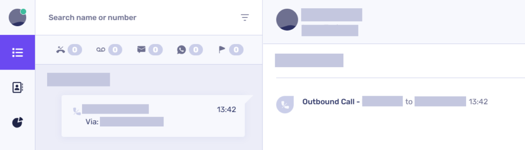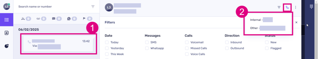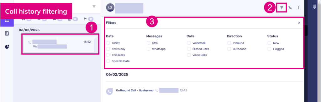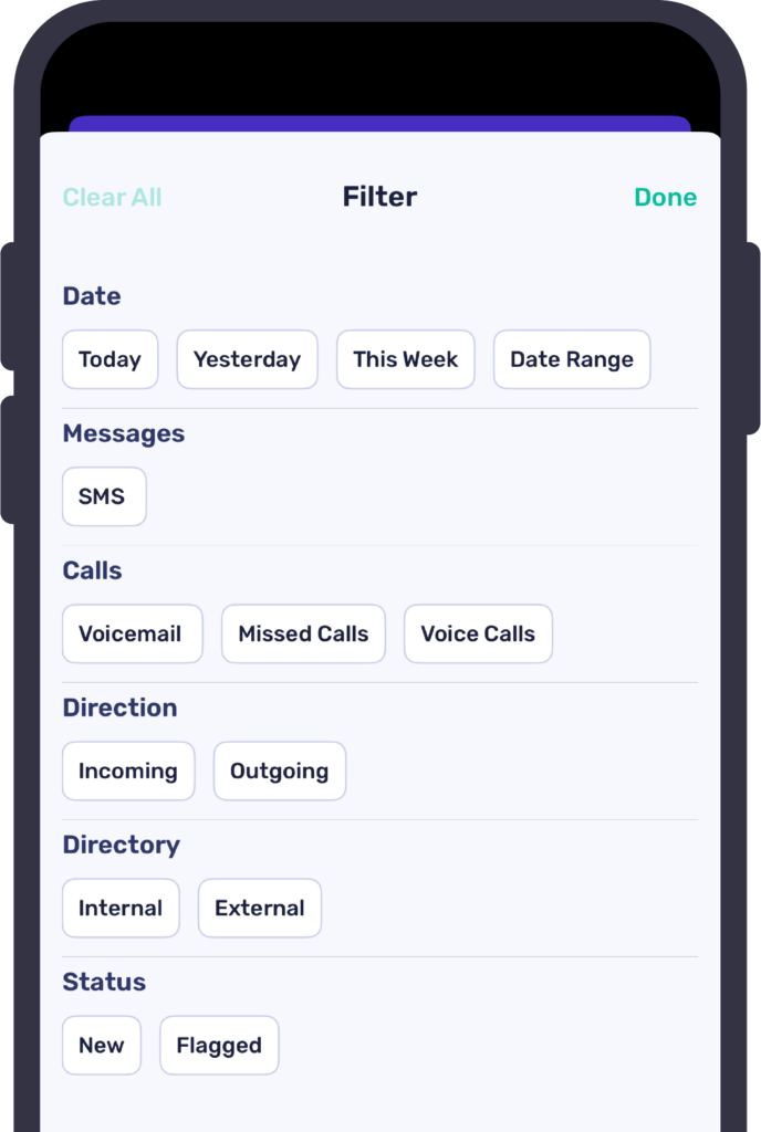 - Filter by date, messages, calls, direction (i.e. inbound or outbound) and status