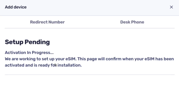 This action will initiate an eSIM request to Anywhere SIM, which facilitates the provision of your eSIM. You will be presented with a ‘Setup Pending’ notice.