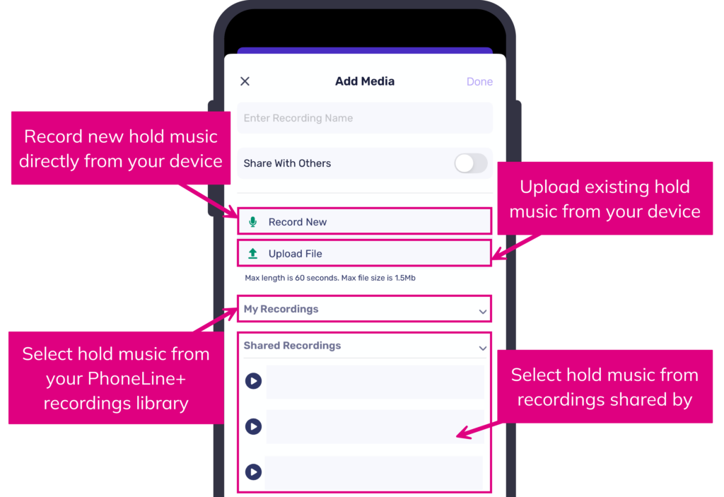In the settings, you can enhance the experience by adding hold music, either by recording your own audio track, uploading an existing one, or using one shared throughout your company.