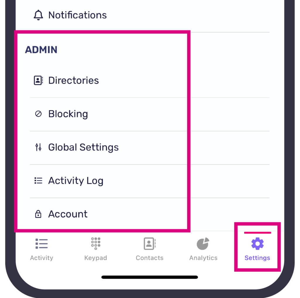 To access the administrator functionality, simply tap the ‘Settings’ cog then navigate down to ‘ADMIN’.