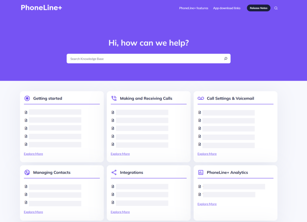 The mobile version of the PhoneLine+ Knowledge Base is also split into categories. Swipe up/down on your screen to view these.