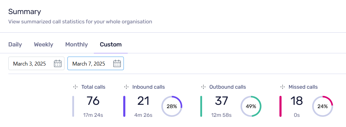 - Summary – An overview summarising your Total, Inbound, Outbound, and Missed calls