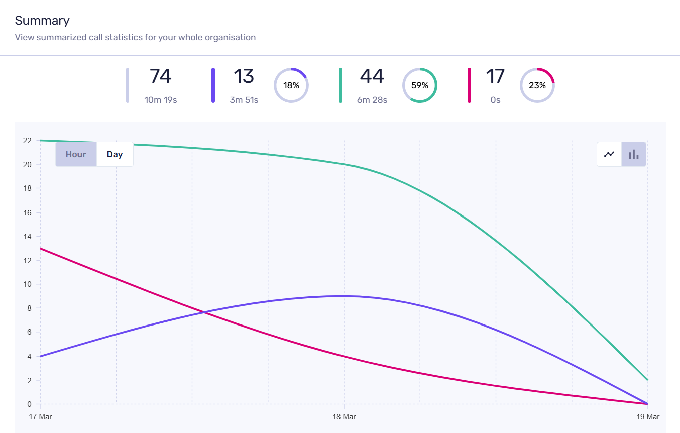 Your ‘Summary’ data can be visualized through a graph, as illustrated below. This information is formed of all call data sources within your organisation.