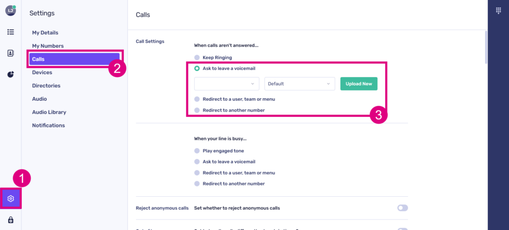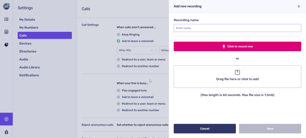 Customising your voicemail message is easy! You have the option to record your own message, upload a pre-recorded one, or choose from a shared library of available recordings.