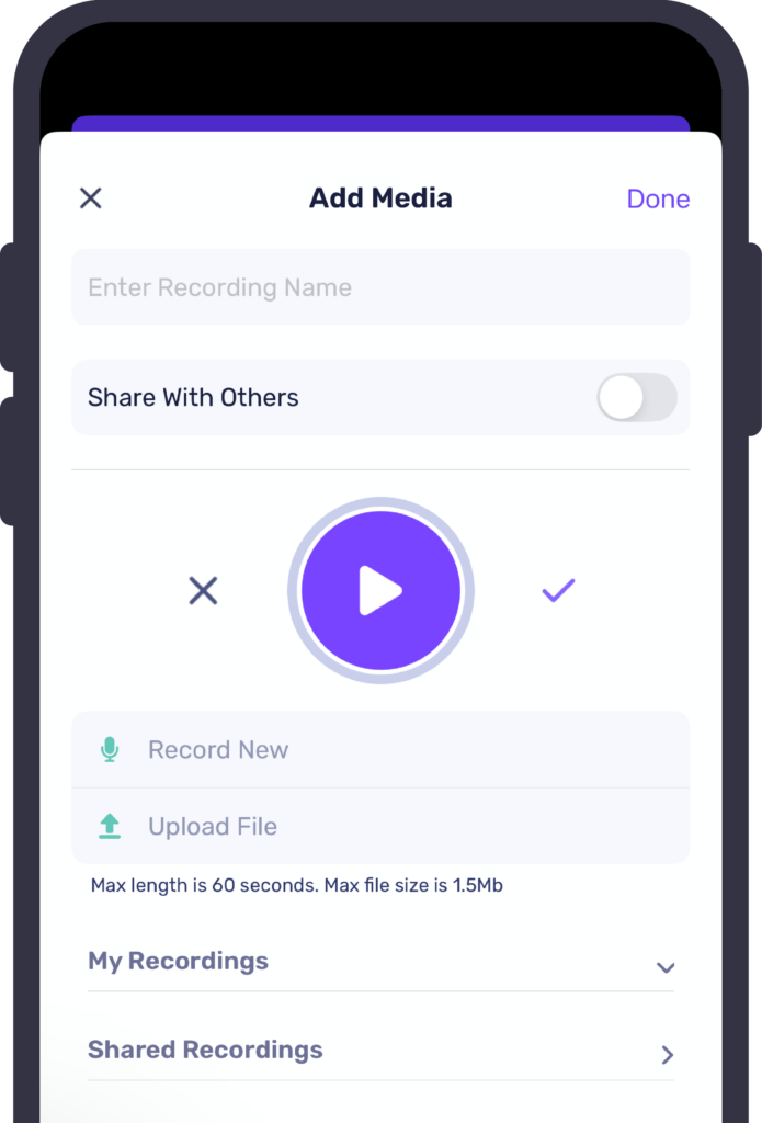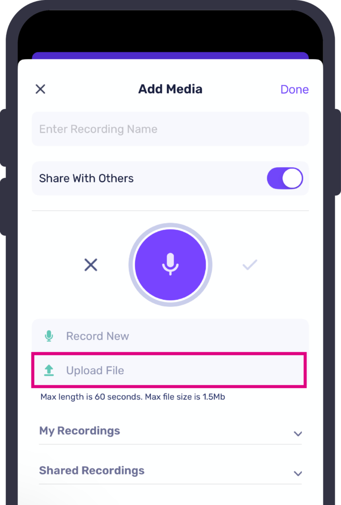 - Upload allows you to import an audio track, if you already have recording you wish to use. The maximum file size is 1.5MB