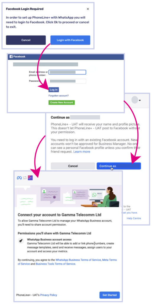 This screen features some guidance to help you get started with setting up your PhoneLine+ to use WhatsApp. To access Facebook, it is essential to have a Facebook Business Manager account. The credentials for this account are what you will use to log in to the platform.