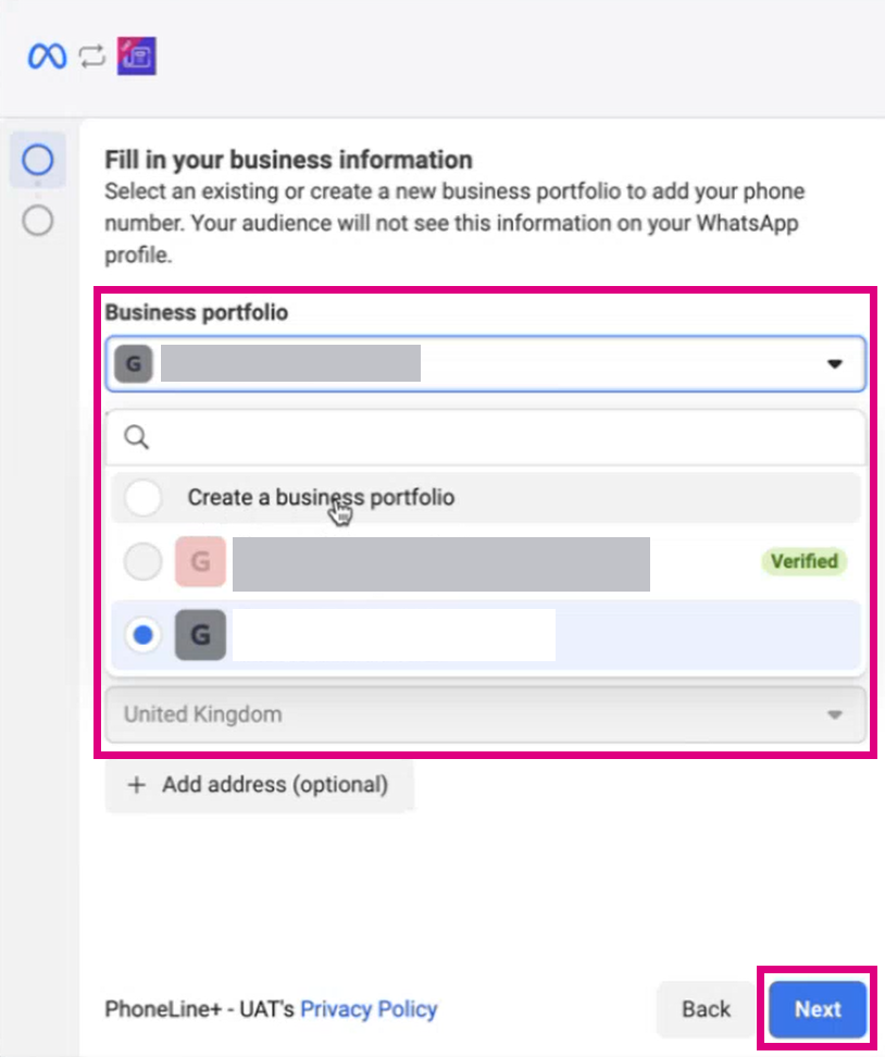 To proceed, please select the Business account from the ‘Business portfolio’ drop-down menu on the screen that appears.