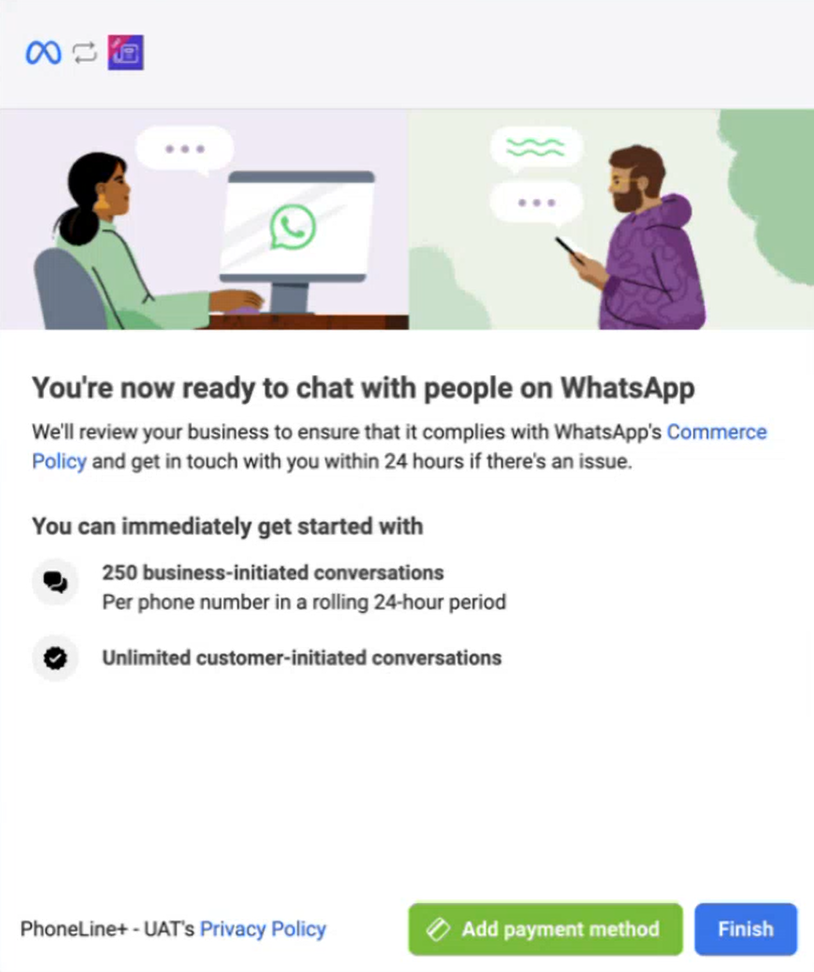 Congratulations! PhoneLine+ is now successfully configured to enable you to send messages to your customers through the WhatsApp Business API using the provided number.