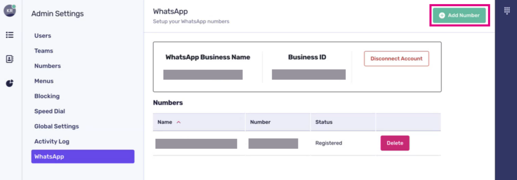 You can view the WhatsApp numbers associated with your account here. To add a new number, simply click on ‘Add number’ located in the top right corner.