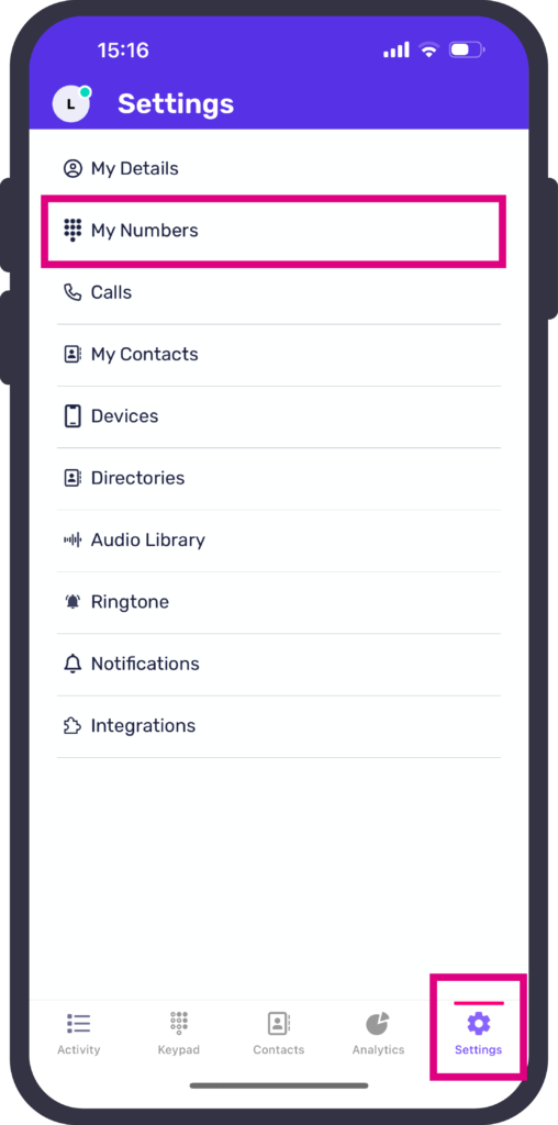 Tap the cog icon to view your settings then tap ‘My Numbers’.
