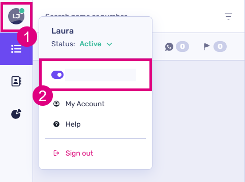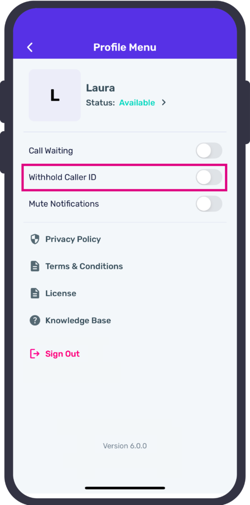 To do this, click your user icon in the top left of the screen and toggle the ‘Withhold Caller ID’ option.